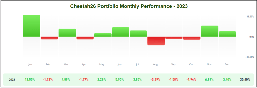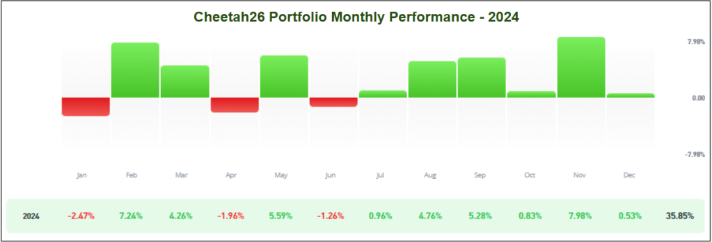The five snapshots below show the monthly performance of Cheetah26 portfolio from inception in September 2020 to December 2024 (5 years).